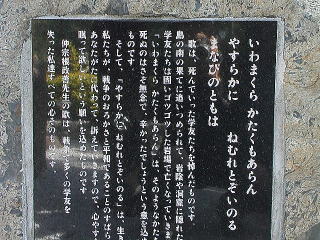 | 太平洋戦争中唯一、日本国内で地上戦が行われた地がここ沖縄です。この沖縄戦で従軍看護婦として犠牲になった「ひめゆり学徒隊」の慰霊塔に黙祷をささげ、往時の状況をつぶさに説明するガイドさんの物悲しい言葉に目頭が熱くなりました。この沖縄戦の戦没者は20万人を超え、このうち民間人の犠牲者が12万人以上といわれ、歴史上稀な悲惨さを物語っています。なお、米軍も1万2千人の戦死者を出したという。 |