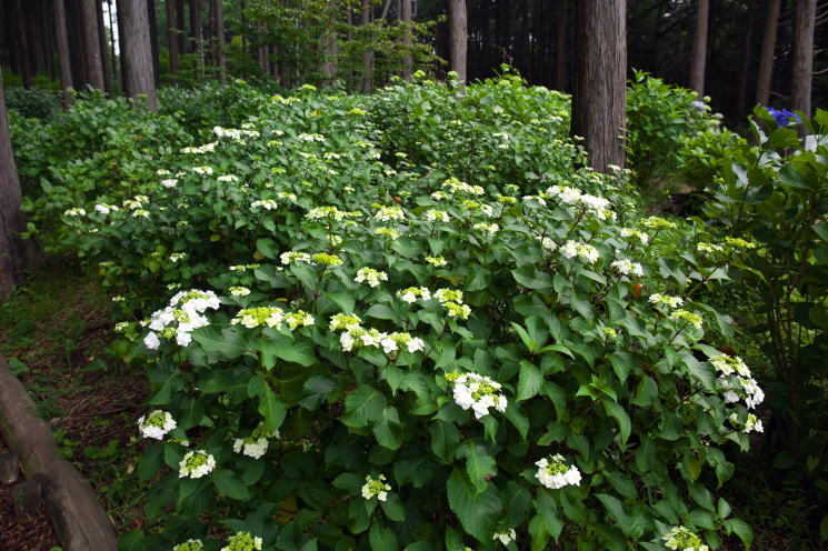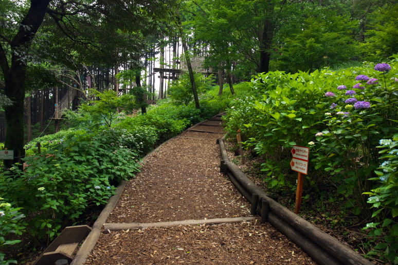 | 三島市にある三島スカイウォークの紫陽花が見頃になりつつあるというので、好天を願いつつ訪問しました。ところが、一向に青空が見えません。期待していた富士山の写真を撮ることができず、残念な思いで目的の「あじさい小径」を散策していました。紫陽花エリアには205種類13000株の紫陽花が植栽されているようですが、満開のピークまではもう一週間くらいはかかりそうでした。そして、紫陽花自体が木立の中にあるので、華々しく咲き誇る感じではなく木陰で静かに花開く・・といった雰囲気の紫陽花景色でした。 |