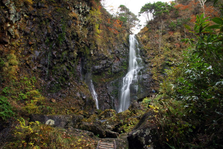 | 幕滝のある幕川温泉は磐梯吾妻スカイラインの会津側に近いところに位置し、標高は1300m程度です。滝は温泉地から距離にして700mほどですが、遊歩道は足場の悪い急斜面が続き、カメラ、三脚を担いで歩くには結構難儀する行程でした。この幕滝へ向かう途中の散策路には赤色や黄色の紅葉樹が沢山あり、現在見頃になっています。よって、紅葉ページとして何枚かの写真を載せてみました。 |