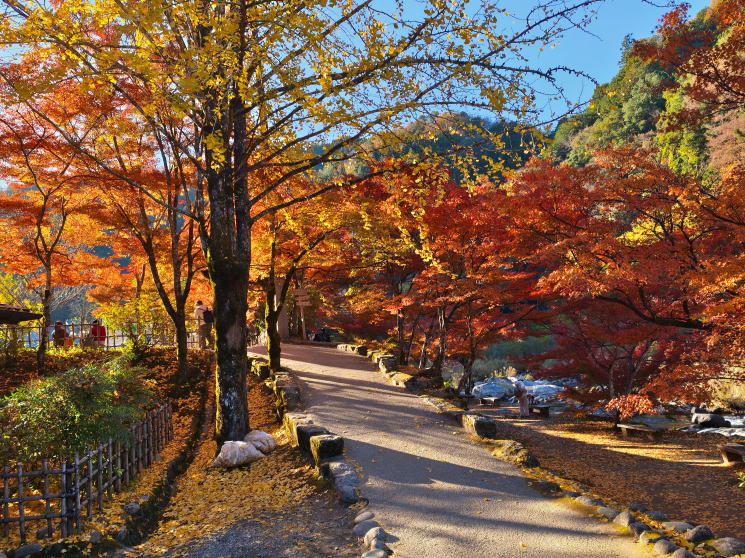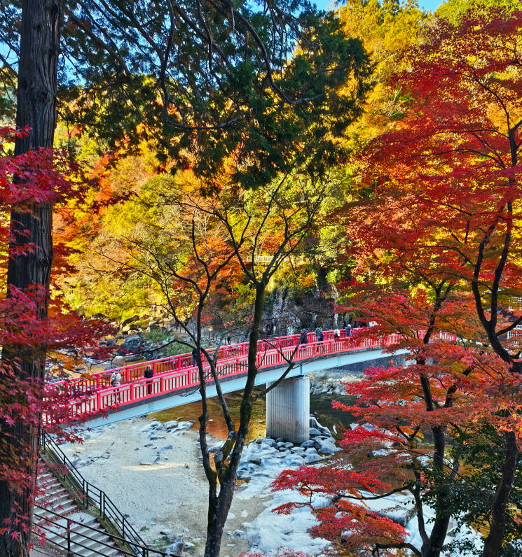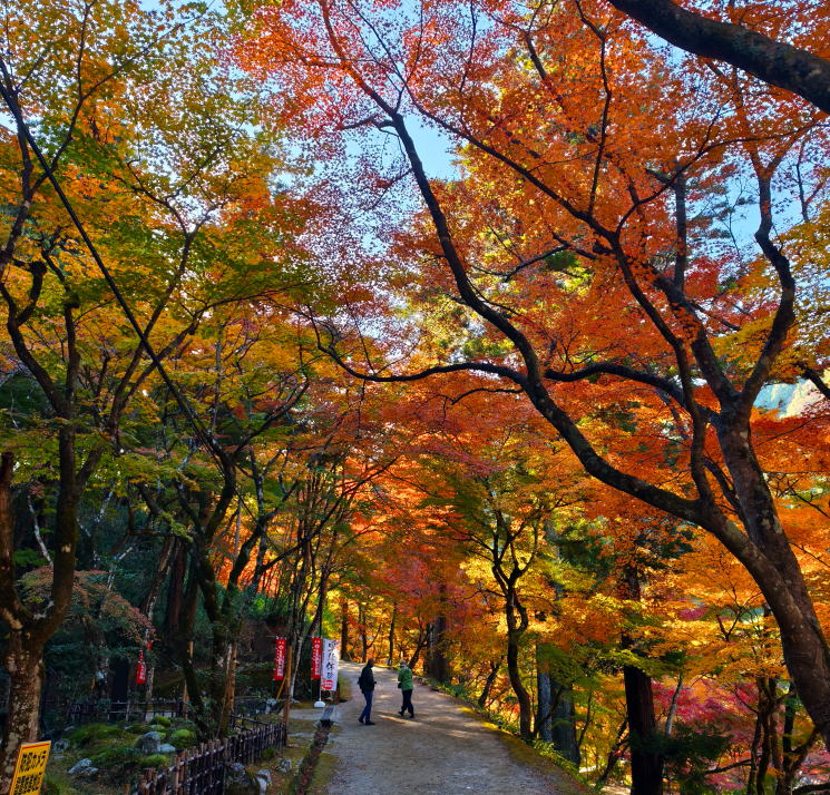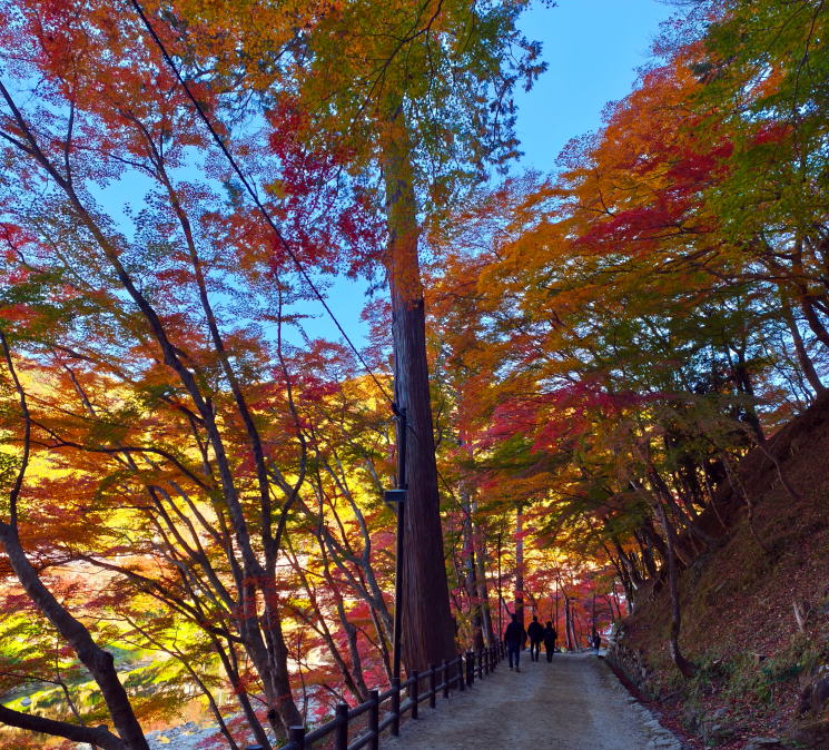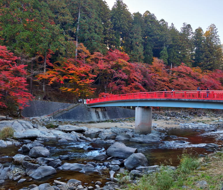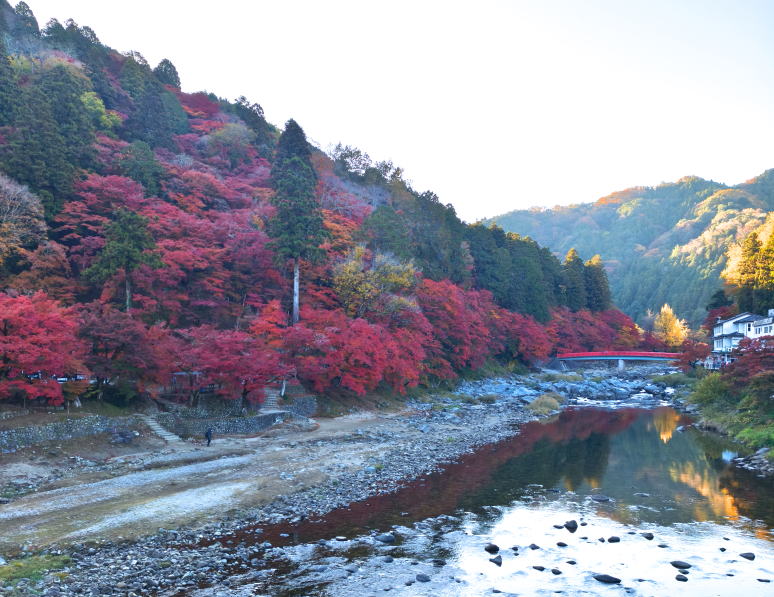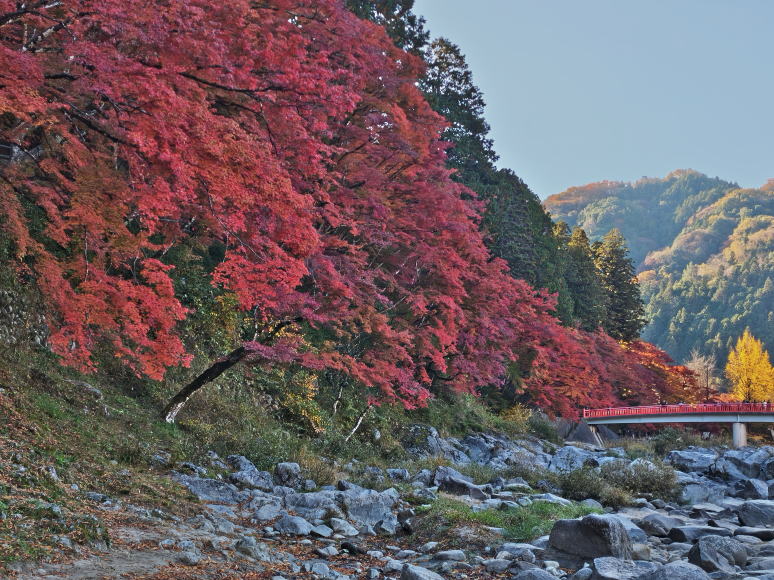| 東海地区を代表する紅葉の名所・香嵐渓には12年前、日帰りツアーバスに乗って訪れています。紅葉めぐりを始めた初期のころで、十分なカメラ装備もなく写したページも色あせてきて、もう一度訪問して納得の写真が撮りたいと思っていました。今日の天気は最高の紅葉日和り、昼間の紅葉とライトアップされた夢のような夜の景色を時間をかけて撮ってきました。そして、香嵐渓の紅葉は今が見頃、駐車場はどこも満杯でしたが幸運にも一瞬のタイミングで駐車することができ、ようやく香嵐渓に向かうことができました。なお、この香嵐渓がある足助町には鳳来寺山の紅葉を見てから山間の道を通って訪れたもので、約4000本のカエデが織りなす香嵐渓の紅葉美を心置きなく満喫でき大満足です。 |