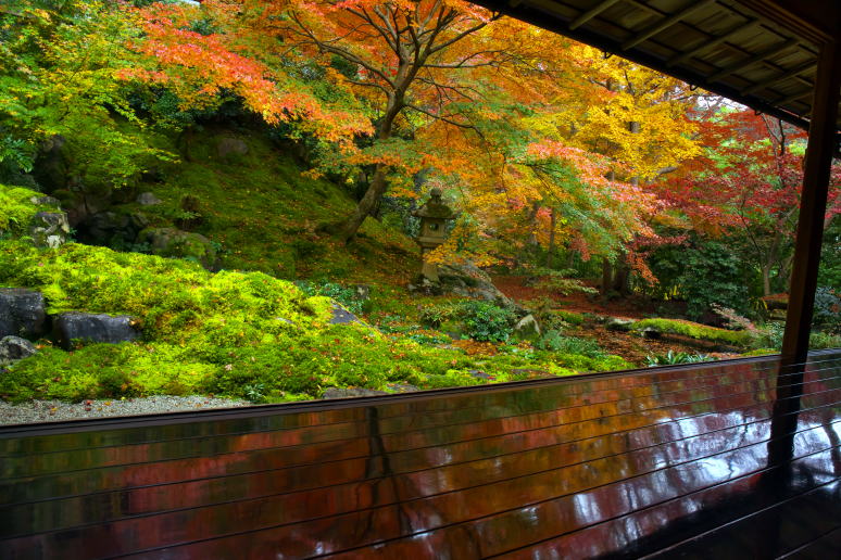 臥龍の庭の紅葉(1階書院から)・・・縁側にリフレクション |