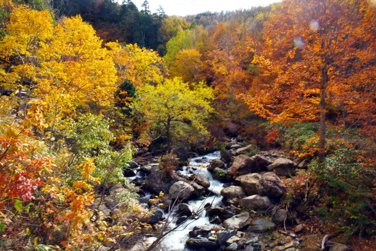| 群馬県みなかみ町にある紅葉の名所、照葉峡には、12年前の紅葉真っ只中の時に訪れています。今回は新潟県湯沢町にある苗場ドラゴンドラを訪問する前日で、今年の照葉峡の紅葉はきっと素晴らしいに違いない・・と予想して再訪したのです。そして天気も上々、期待にたがわず目の覚めるような紅葉景色に出会えました。俳人、水原秋桜子が命名したという大小11の滝との美しい紅葉写真も撮れて大満足です。 |