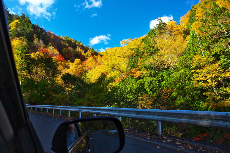 照葉峡に入り早速、目にした紅葉・・・車内から撮影 |