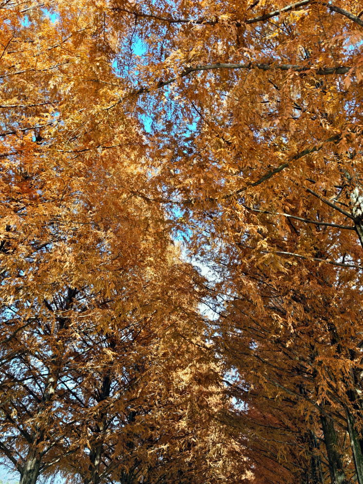 青空に映えるメタセコイアの紅葉・・・落葉がほとんど見えない |