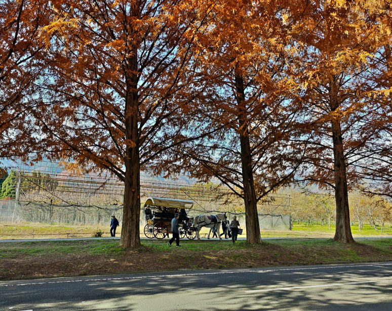 メタセコイア並木の紅葉・・・農園・マキノピックランド前から望む |