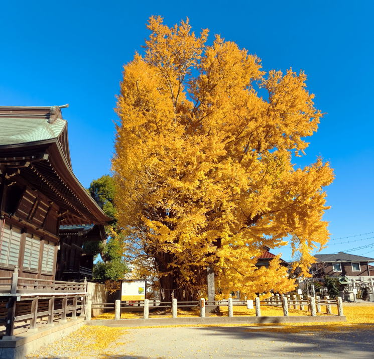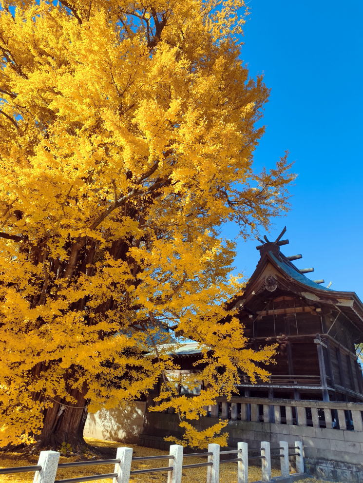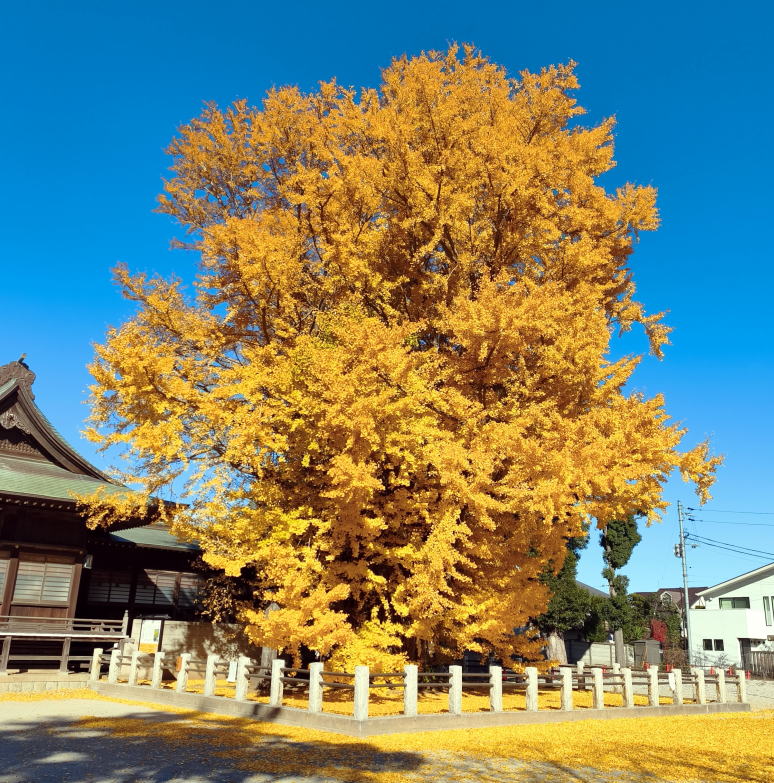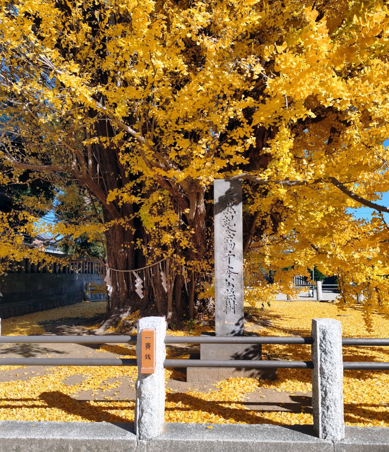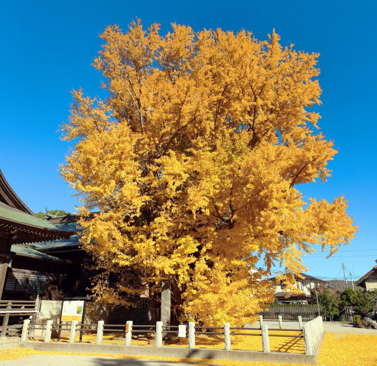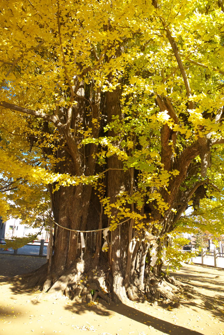 境内の社殿の横に聳え立つ千本公孫樹(千年イチョウ)は多数の樹幹が寄り集まって、まるで根元から一本の大樹がのびているように観察されます。この樹形から千本公孫樹の名で呼ばれるようになったといい、推定樹齢は1200年を超え国指定の天然記念物になっています。今日は抜けるような青空、見事な千本公孫樹の黄葉を眺めながらその素晴らしさ、美しさに魅入っていました。 |