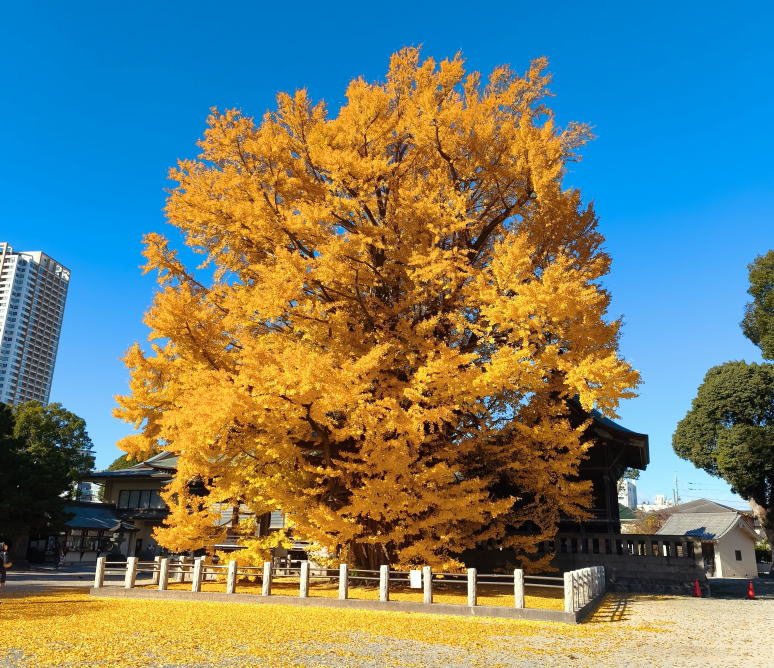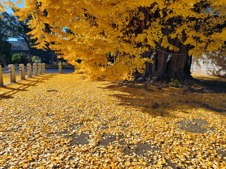 | 2年ぶりに訪れた市川市にある葛飾天満宮の千本公孫樹(千年イチョウ)です。奇しくも2年前と同じ12月4日でした。今年は全体的に紅葉時期が遅れ気味だったことから、ここの紅葉も見頃始まりごろと予想したのですが実際は見頃終盤といった紅葉景色でした。何はともあれ青空の元、見事な千本公孫樹の紅葉を目の当たりにしてスマホのシャッターを押す手も緊張気味でした。 |