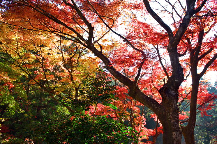 上の写真左手をズームアップして・・・境内周囲の大きな森林に映える紅葉