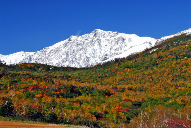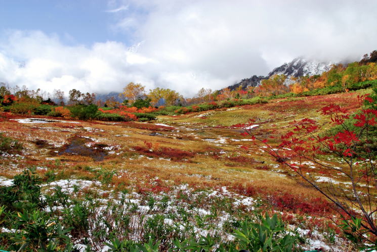 浮島湿原付近(標高1910m)から見る紅葉と緑そして、雪山のコントラスト |