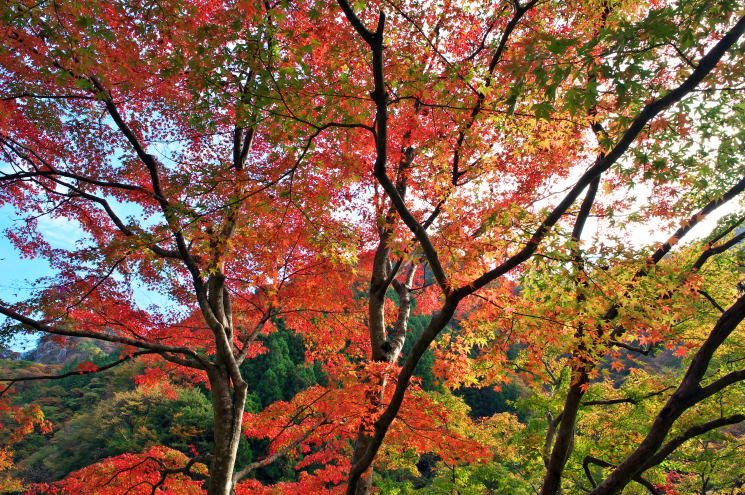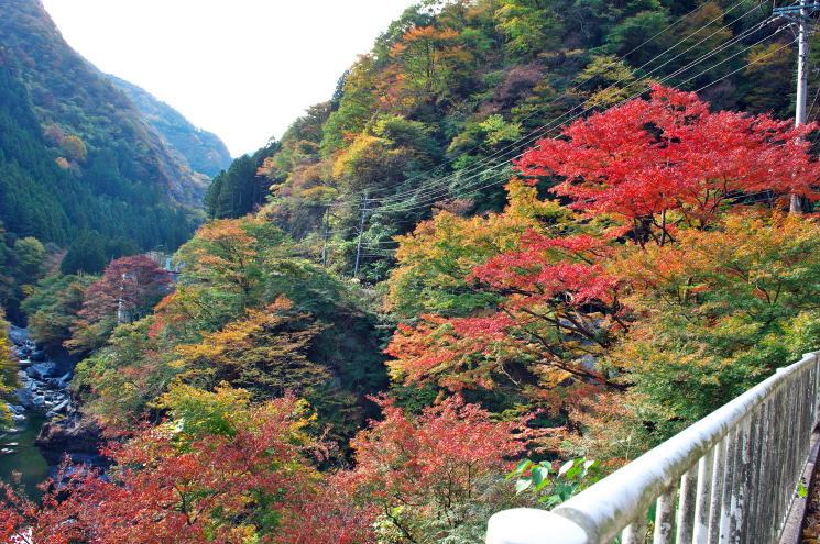 | 秩父市のR-140号(彩甲斐街道)を進み、大滝地区に入って間もなく街道沿いに見えるのが金蔵落しの渓流です。誰が名づけたか、金蔵落しの渓流というぶっそうな名前ですが、荒川の上流に位置し奥秩父地方の紅葉スポットでもあります。紅葉の最盛期までもう何日か必要ですが、最盛期前の紅葉でも深い渓谷を彩る景色はなかなかのものでした。金蔵落しの渓流の位置はR-140号沿いの「強石バス停」前の渓流となります。 |