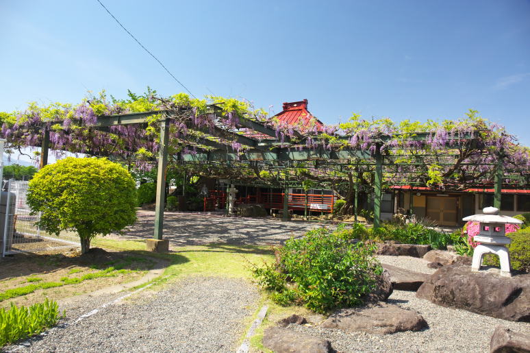 | 甲府市の南部に位置する慈恩寺には樹齢200年以上といわれる藤棚があり、ほぼ見頃に入った藤の花が庭いっぱいに広がっていました。この藤は県の天然記念物にも指定されており、幹の太さにも目を見張るものがありました。藤の花房自体はあまり長くなく、50cm以下だったでしょうか。 |