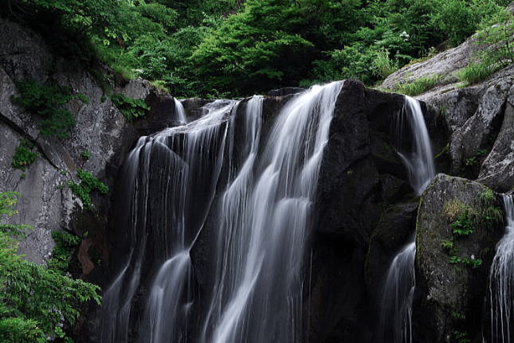 下段の落ち口をズームアップ・・・黒い岩肌に絹の糸を垂らしたよう |