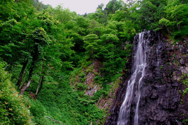 一の滝の全景・・・落差38m、黒い岩肌にぶつかりながら落ちるきれいな滝です