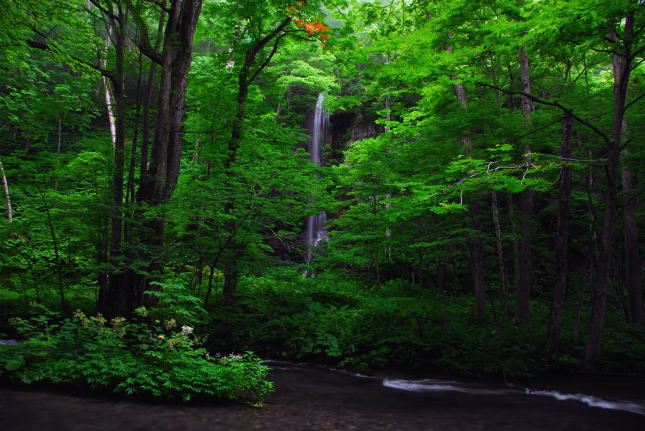 白糸の滝、日本にはこの名前の滝が沢山あります。奥入瀬渓流の白糸の滝もなかなか見ごたのする滝で深緑の中を繊細に流れ落ちていました。