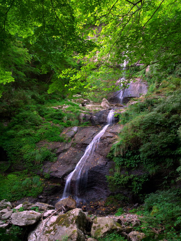 | 白猪の滝からさらにR-494号線をくねくねと登って行くと、唐岬の滝(からかいの滝)の看板があり、立派な駐車場に車を止めて歩き出す。山が伐採されていて炎天下の歩きがつらい、でも頑張って滝下まで到着。だが、滝の全体は樹木に覆われて見ることはできない。さらに、滝の正面に下りるのも危険なので、撮れる写真で我慢して早々に引き揚げました。この唐岬の滝も水量が少なく見応え感はありません。滝の位置は重信川の支流、表川の上流にある滝で、落差114mの段瀑(7段)です。 |