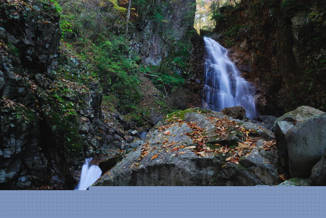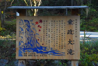 | 乗政大滝は下呂温泉から東方面に20kmくらい、乗政川の上流にあって高森山などの清流を集めて落ちる滝は水もきれいで近くにはワサビ田などもありました。車では結構山深い感じの道を走りますが、乗政キャンプ上から歩いて5、6分で見られる比較的お気軽な滝です。 |