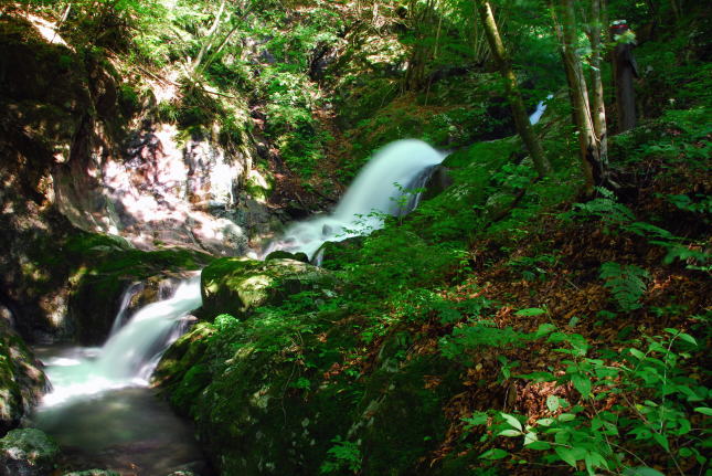 | この三段の滝は下仁田町の奥栗山渓谷にある滝で、規模は南牧町の三段の滝より小さく落差は3段合わせて20m程度。 奥栗山渓谷へのアプローチは未舗装の山道をしばらく走って駐車場があり、そこから山の斜面、渓流沿いを歩いて20分少しで到着しました。この滝も水量が多く、ネットで知る滝のイメージとは大違いで、見事な流れを見せていました。 |