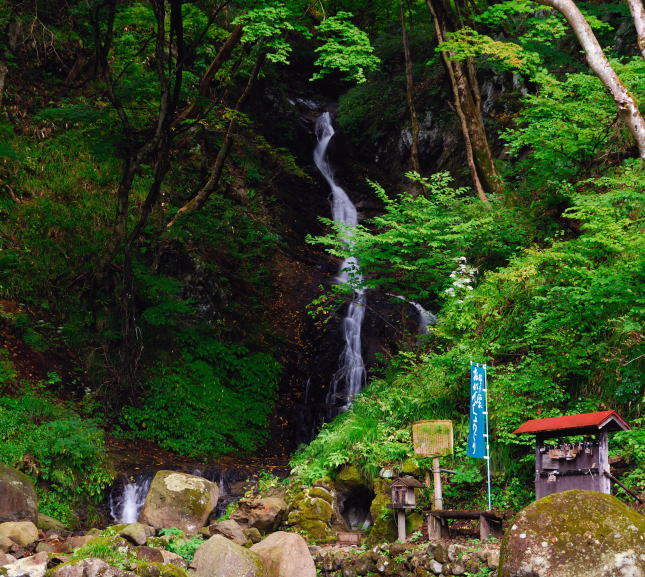 落差12mくらいで優雅に流れる・・・滝の案内板に昔村人が滝に打たれて願を掛けたという