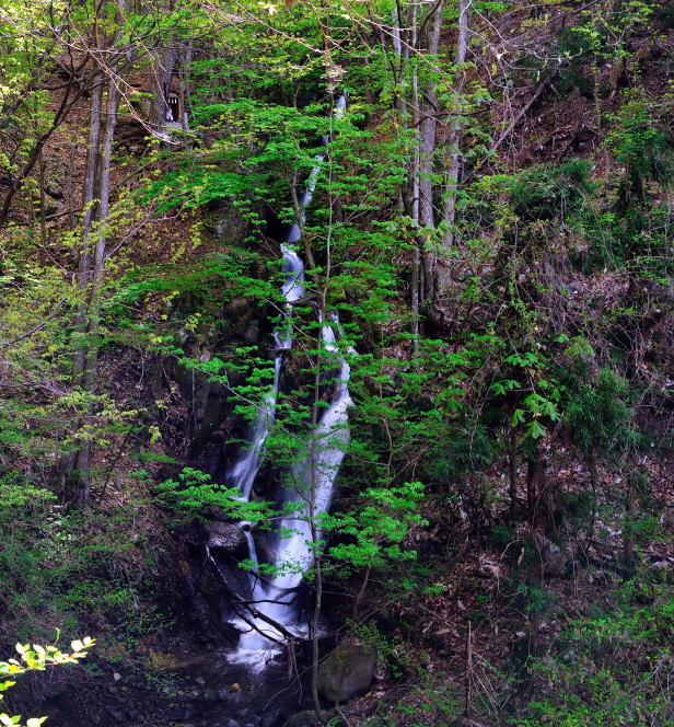 | 今年最初の滝訪問がこの不動沢不動の滝です。片品村にある花咲天王桜を訪問しての帰り道に寄ったものでR120号からすぐ近く(駐車場から歩いて5、6分)にあり、落差20mの段瀑が緑になりつつある山肌をぬって落ちていました。 |
