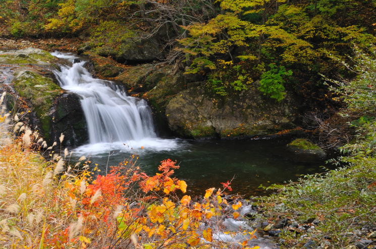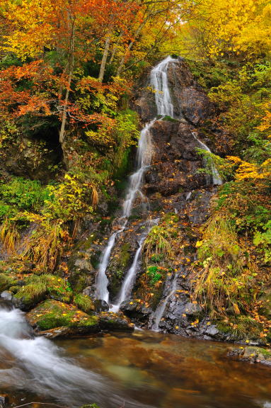 ・・・ 対岸の岩肌から紅葉の中を滑り落ちる、落差12m |