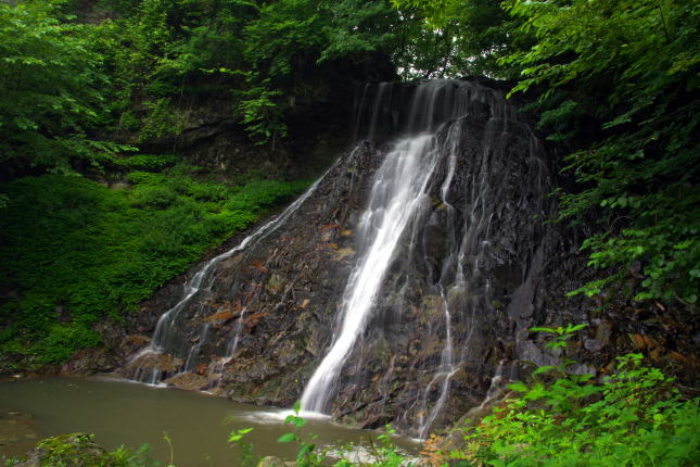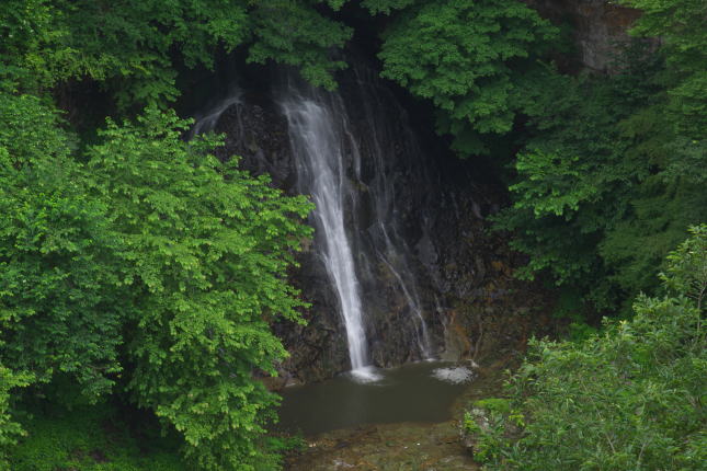 | 仙下不動の滝は中之条町の四万川に合流する大竹川に懸かる滝です。落差は約12mで末広がりに落ち、水量もまあまあでなかなか見応えのする滝でした。そして、中之条町の集落に落ちる仙下不動の滝は四万川にかかる吊り橋(上妻橋)上からもよく見ることができ、滝までの遊歩道を6、7分歩けば滝前にも出られます。 |