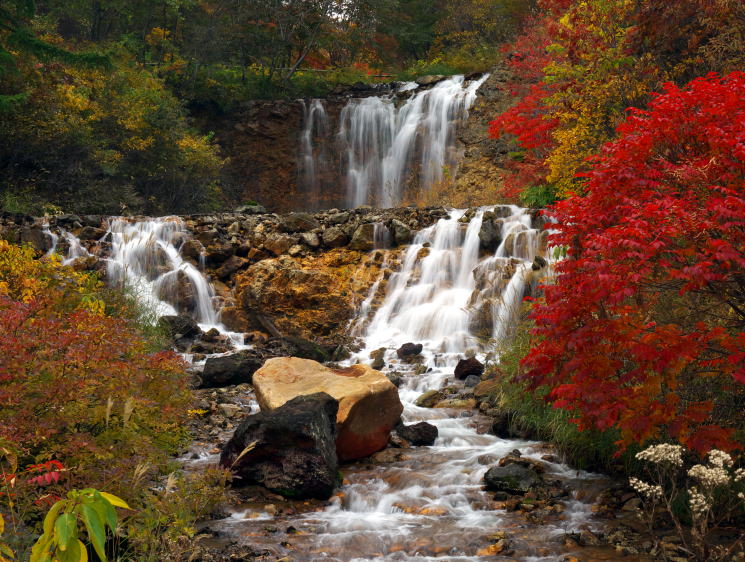 | この温泉大滝はチャツボミゴケ公園内にあり、群馬県中之条町の山深い奥草津に位置しています。紅葉の情報でも今が見頃と知り訪ねてみました。温泉大滝はチャツボミゴケ公園内の穴地獄に向かう駐車場付近にあり、渓流瀑でなかなか美しい滝でした。なお、緑濃いチャツボミゴケの群生は県の天然記念物に指定され、観光面でも脚光をあびているところです。 |