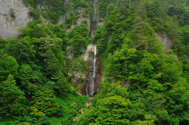 しりたか滝は白山スーパー林道を石川県側へ抜ける最後に見られる滝。落差は約50m、3段に流れる雄大な滝は生い茂った木々の間を糸を引くように流れ落とす。