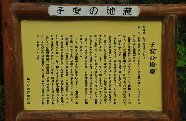 子安地蔵の案内板・・・岩窟(がんくつ)を御神体とする神社があって、樹叢は県の天記然念物という
