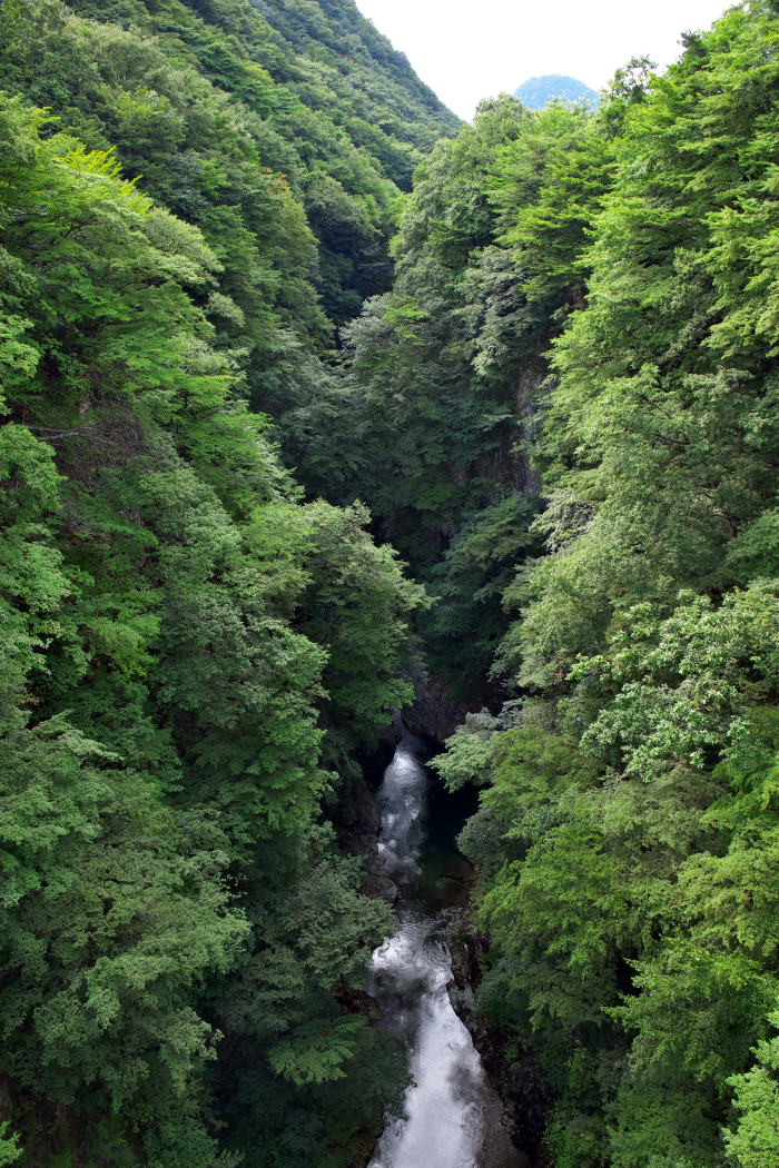 | 鳳鳴四十八滝は一つの滝ではなく、峡谷にかかる大小様々な滝を総称して名付けられたようです。仙台市街から西の方角、R-48号線(作並街道)沿いの仙台ハイランド入口を過ぎたあたりにあり、標識と大きな駐車場があるのですぐに分かりました。お蕎麦屋さんで昼食を済ませた後、早速滝への遊歩道を歩いて鳳鳴四十八滝に向かいました。といっても、すぐに観瀑台に到着し、見下ろす形で写真やビデオを撮ってきました。この付近の渓流は深く、到底下からの撮影は出来ませんが、新緑の中を流れる鳳鳴四十八滝の美しさには驚きました。秋の紅葉時期も素晴らしいでしょう、何かの機会にもう一度訪れてみたい。 |