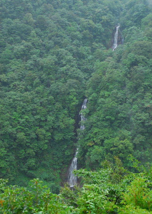 | 宮城県蔵王町の澄川にかかる三階の滝は落差181mという巨大な滝で、蔵王エコーラインの展望台から望みます。昨日立ち寄るも濃霧で何も見えず、翌朝は雨で霧も出ている始末、もう滝見は絶望とあきらめていました。が、時間が経つに従って雨も小ぶりになり周囲も明るくなる、絶望が希望に変わって再度訪ねたものです。見えました!素晴らしい日本の滝100選・三階の滝、ほれぼれするような蔵王の景観の中に悠然と姿を現わしました。 |