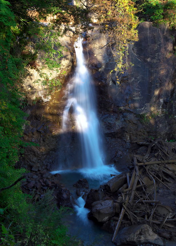 | 栗駒高原の紅葉散策に行く途中、県道42号線沿いにある行者滝に寄ってみました。駐車場に車を止め早々に滝見台付近から写真を撮るも、2008年6月に発生した「岩手・宮城内陸地震」の影響で崩壊したヶ所も見られやや荒れた感じでした。この滝は栗駒ダムの上流に位置し昔、山伏や参詣人などが登山口にあたるこの滝で身を清め、栗駒山の「御室」にある駒形根神社奥院に詣でた事から名付けられたという。落差は30mほどの滝で今の時期水量は少ないようです。 |