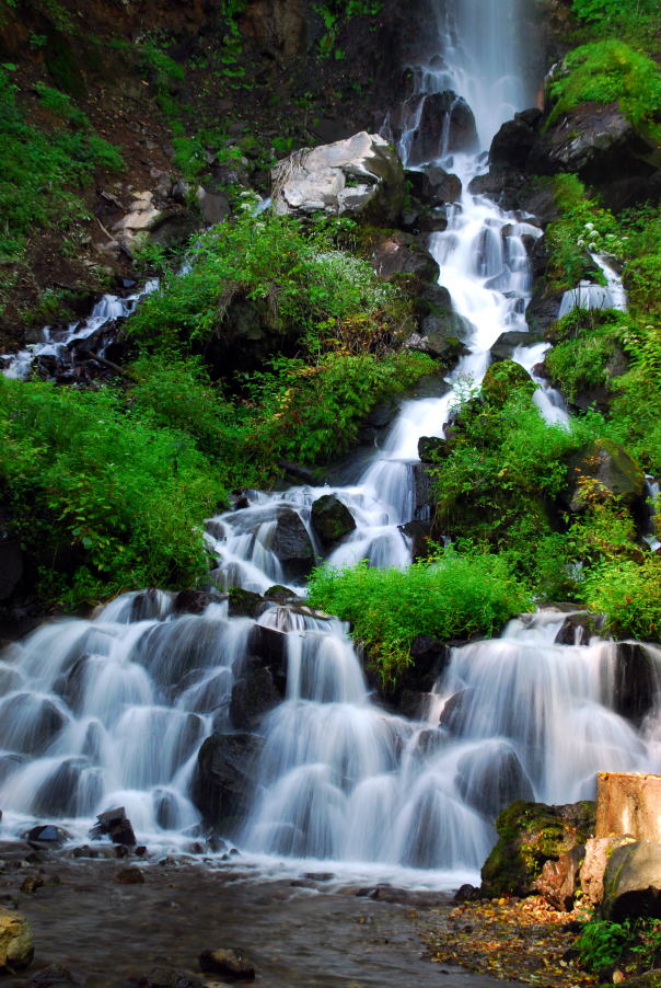 | 軽井沢一の落差をもつ千ケ滝はセゾン現代美術館から北へ約1kmほど車道を走った所の遊歩道「千ケ滝せせらぎの道」から入ります。途中、カラマツ林の中を抜け、ゆるやかな上り坂を過ぎると川の清々しいせせらぎが聞こえ20分位歩いて千ケ滝に到着しました。そして、予想以上の見事な千ケ滝を間近に見て寝不足気味の疲れも一気に癒されました。 |