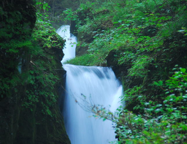 竜返の滝には軽井沢側から行って、白糸ハイランドウェイ途中の小瀬温泉手前の遊歩道を歩いて15分くらいで到着します。落差は5m程といいますが水量が多く、轟音と共に落下する迫力はかなりのもので滝壺付近ではその凄まじさに圧倒されました。