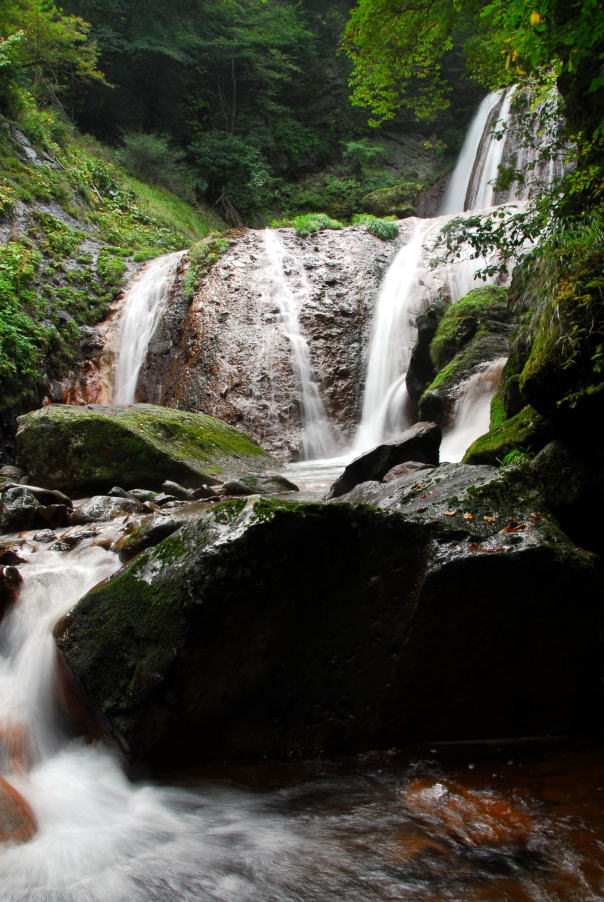 | 王滝には横谷観音のある駐車場まで車で来て、展望広場から王滝の景観を上から眺望その後、遊歩道を下って王滝展望台に行きました。写真撮影後、かなり厳しい沢道を歩きようやくの思いで王滝の近くまでたどり着き、滝壺付近か見る王滝の神秘的で荘厳な姿を堪能しました。そして、誰一人いない滝まわり、多少の危険は覚悟でベストポジションまで三脚を運び、思う存分の写真撮影に過ぎる時間も忘れていました。 |