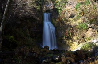 | 尾ノ島の滝も木曽町の開田高原にあり、開田高原キャンプ場から未舗装の道を少し進むと駐車場があって、数百メートル歩くと滝に到着しました。尾ノ島の滝は冷川(つめたがわ)の上流にかかる落差30mの豪快な滝で、近くでは水しぶきが降りかかって撮影するのも大変でした。特に、最近の降雨で水量も多かったのでしょう、気温も3℃くらいで周囲の冷気は真冬のような感じでした。なお、尾ノ島の滝は御嶽山の開山中興の祖と崇められる覚明行者ゆかりの修行の滝だそうです。 |