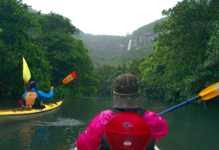 | ピナイサーラの滝は西表島の船浦湾から見上げると遠くに見えます。雨降る中、カヤックを漕いで美しいマングローブ林を見ながら船着場に着きました、1時間くらいでしょうか。カヤックを下りてジャングルの遊歩道を歩き、ピナイサーラの滝に向かいました。そして、目にしたピナイサーラの滝は最近の雨続きで、物凄い水量となって落ちていました。滝壺付近からの撮影ではカメラのレンズが一瞬にして水滴で覆われうまく写せない、こんなに苦労して写真を撮ったのも久しいことです。ピナイサーラの滝は沖縄県で最大の滝、落差55mからの落水は迫力満点でした。マリュドゥの滝が日本の滝100選の一つですが、このピナイサーラの滝もそれに匹敵する素晴らしい滝です。 なお、このピナイサーラの滝へはエル・ビー・カヤックステーションの「ピナイサーラの滝壺&滝上コース」に予約し、猿田ガイドさんの引率と細やかなガイドで来ることができました。今回の滝上コースは雨の影響もあり、滝上付近は少々危険だということで滝壺コースのみで帰ってきました。 残念ですが、体力的には滝壺コースで精一杯だったでしょう・・・。 |