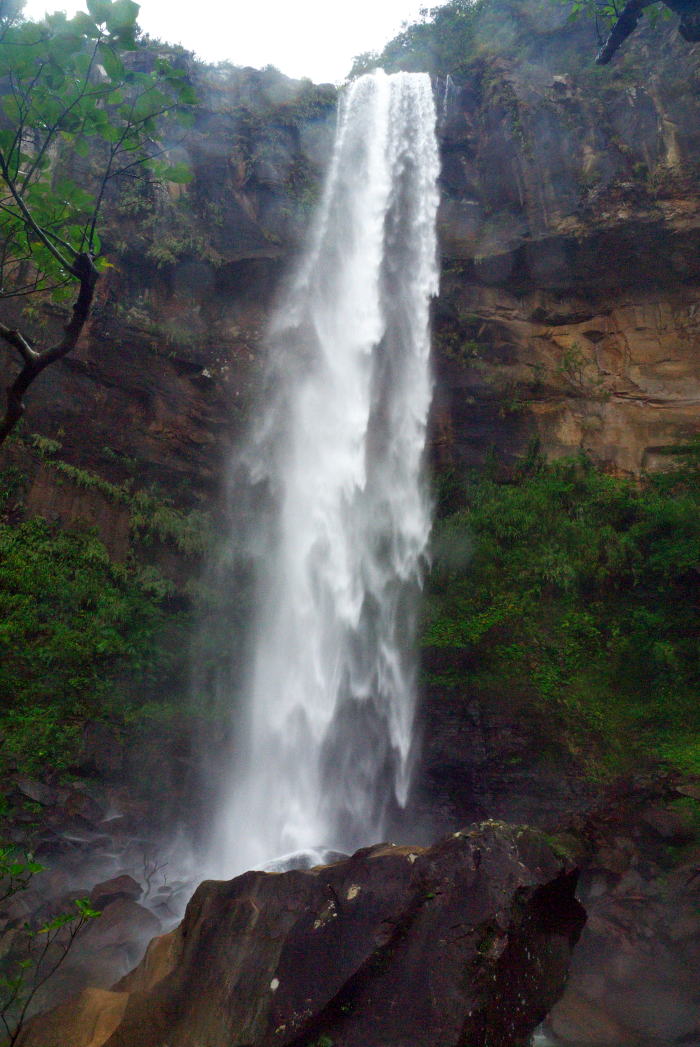 滝壺付近から見上げる・・・水しぶきがかかりすごい迫力です