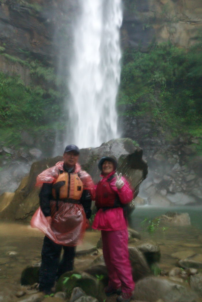 雨と滝の水しぶきが降りそそぐ中、撮ってくれたお化けのような写真です