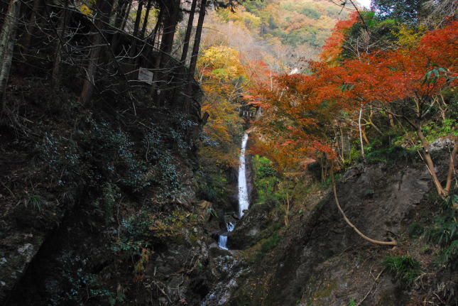 滝の落ち口付近の紅葉・・・右手上部に不動明王像が見える