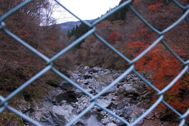 | 不動滝は秩父市大滝の大除沢にあることから大除沢の不動滝と呼ばれています。秩父湖からR140号線を走っていくと不動滝の案内板と降り口があり、一旦川まで降りて橋を渡ると急な登りになり不動様の横を過ぎると大除沢・不動滝が見えてきました。落差約50mを3段で落下する不動滝の全容は一望出来ません。が、水量も豊富で水も綺麗まして、紅葉の中にたたずむ不動滝の景色は先に見た丸神の滝に優るとも劣らない素晴らしいものでした。 |