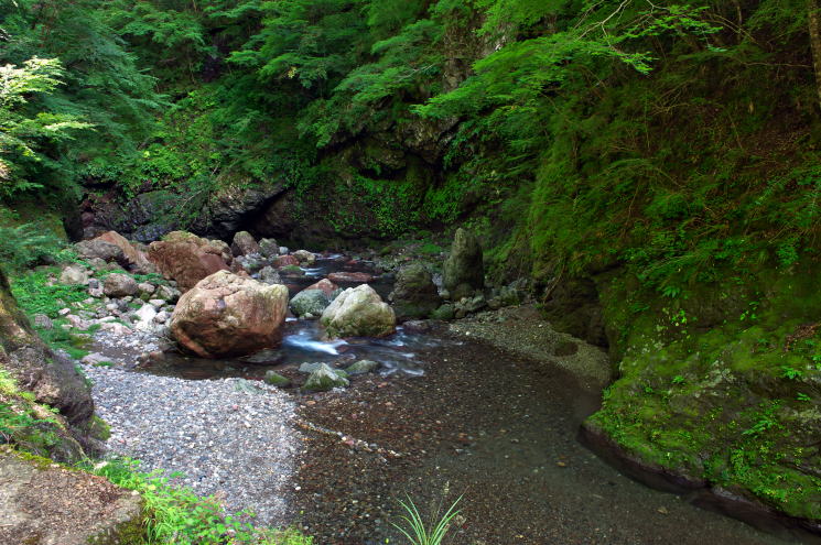 渓流に降りて大釜の滝に近づく・・・両側のそそり立つ岩壁に囲まれる