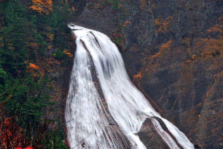 | 滑川大滝へは米沢市の滑川温泉「福島屋」の裏を通り、なだらかな登山道を歩いて40分くらいで高台にある展望台に着きました。 雨の中、パッと開かれた色濃い紅葉の景色の中に優美に羽を広げた滑川大滝が目に飛び込んできました。 スゴイ!そんな言葉もこの景色には陳腐に思えた・・・夢のような感激の景色に、雨だったが来てよかった!と心底思いました。そして、展望台から木の根をつかみながら恐るおそる山を下って沢に出、雨で増水した危険な渓流を乗り越えやっとの思いで滝壺までたどり着きました。所要時間はいったいどれほどであったろうか・・・。ついに目の前に現れた滑川大滝、もう言葉では表現できない、ただ呆然と立ちつくすのみでした。 私が今までに出会って一番に感動した滝、それが滑川大滝です。 |
