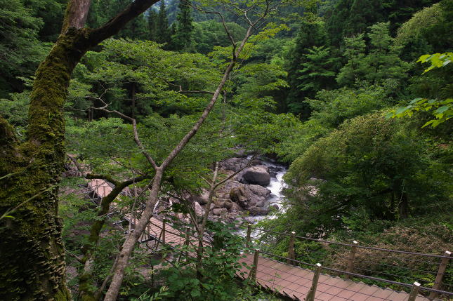 | 大柳川渓谷の本流に架かる天渕の滝です、観音滝を見た後この滝に到着しました。天渕の滝の落差は約20m、滝の正面に行く散策路は壊れていて進めませんが、やや高い位置から巨岩を滑り落ちる天渕の滝を眺めることができました。水量も多くなかなか見栄えのする滝です、途中竜馬渕など変化に富んだ渓流美も見逃せません。 |