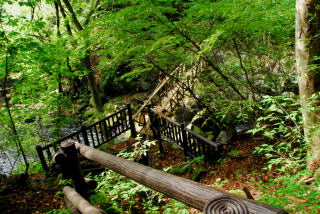 名勝・大滝とある看板 1の滝を見てさらに階段を下りる・・・前方に橋 |