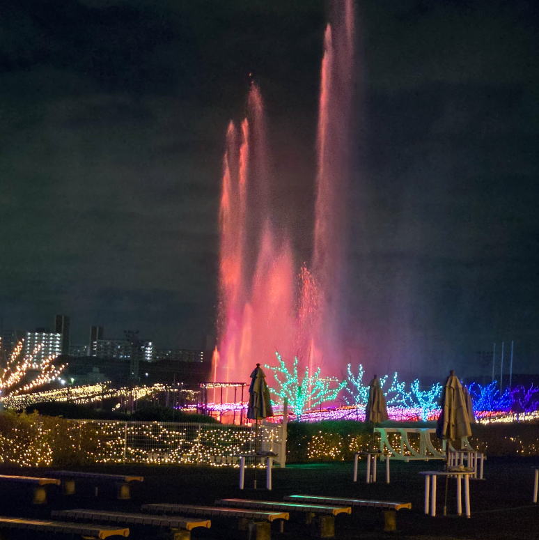 ビデオ撮影・・・虹色に輝く光の大噴水ショー