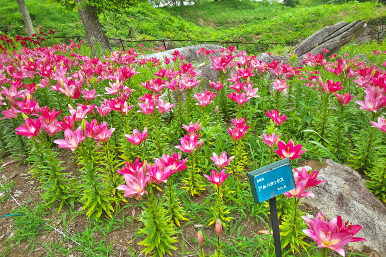 | 福島県平田村にある「ジュピアランドひらた」のゆり園です。紫陽花めぐりで訪れましたが、ゆり園もほぼ見頃になっていたので写真を撮ってきました。このゆり園には35種、約35,000本のゆりが植栽されているといい、なだらかな山の斜面で美しく咲き誇っていました。敷地も相当広いので、今後もゆりの数がさらに増えていくことでしょう。 |