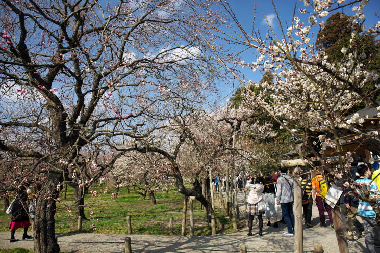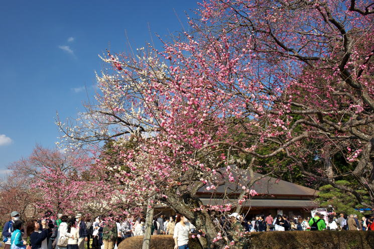 | 水戸市にある日本三名園のひとつ、水戸偕楽園の梅を見るのは7年ぶりです。前回は2月下旬の訪問で梅は7~8分咲きのほぼ満開状態でした。今年の梅の開花は例年より2週間くらい遅れているそうで、今日まではまだ50%くらいの開花状況です。園内には約100品種3,000本もの梅があり、広大な水戸偕楽園園内を散策しながら見頃の梅を探して写真に収めてきました。通常ですと、今の時期は中咲き梅が中心で咲き広がっているのでしょう。そして今日は日曜日、天気も快晴となり梅見の観光客で大賑わいでした。 |