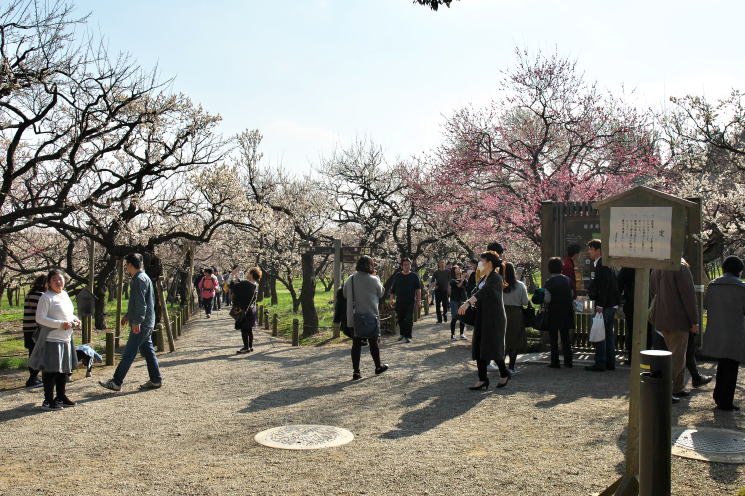 御成門から園内の梅林風景・・・梅は50%の開花状況 |