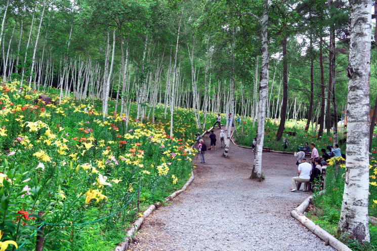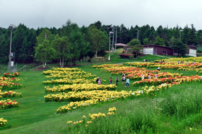 | 長野県富士見町の標高1、300mの高原に富士見高原ゆりの里があり、ゆりの種類30種以上、500万輪に及ぶ膨大な数のゆりが草原を埋め尽くしていました。園内は3つのエリア(ロマンスゆり園、白樺ゆり園、展望ゆり園)に分かれ、リフトに乗って移動しそのリフトからも広大なゆり群を望むことができます。きょうの天気は曇り空で花の写真撮影にはもってこいの条件といえますが、青空の元の景色も期待しましたが・・・。 |