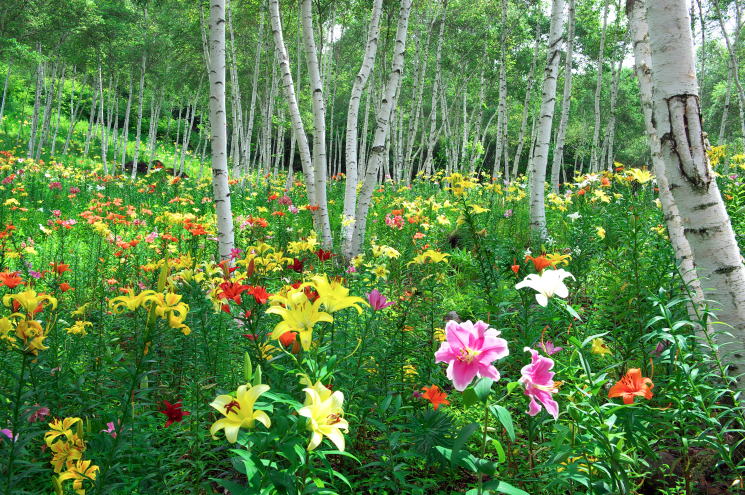 白樺林に赤いゆりが映える